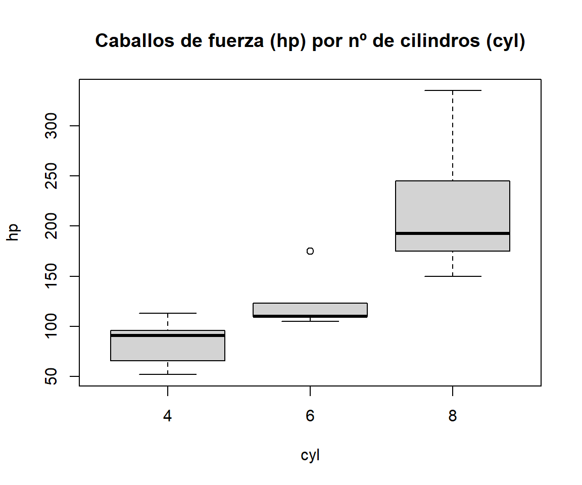 boxplot(hp ~ cyl, data = mtcars, main = "Caballos de fuerza (hp) por nº de cilindros (cyl)")