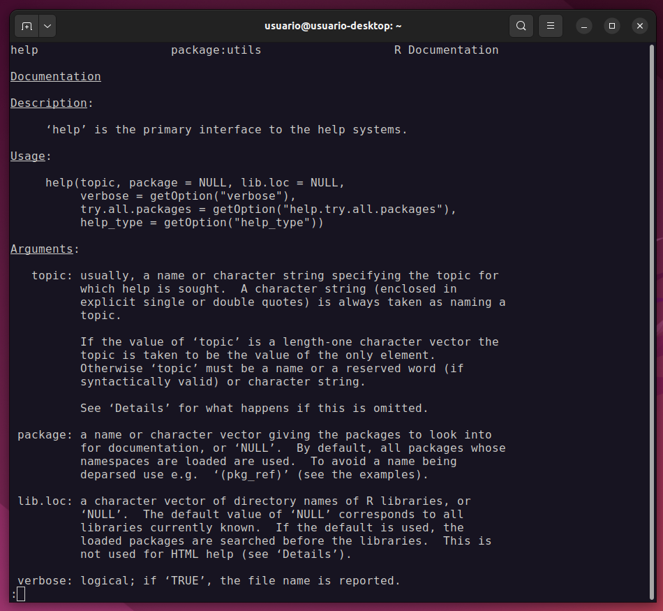 Existen múltiples formas de consultar esta documentación. Si nos encontramos trabajando directamente desde una consola de R, podremos invocar la ayuda con la función help(funcion), donde funcion es el nombre de la función o el objeto sobre el que estamos requiriendo la documentación. Por ejemplo, con la formula help(help) podemos obtener la ayuda de la función de ayuda: