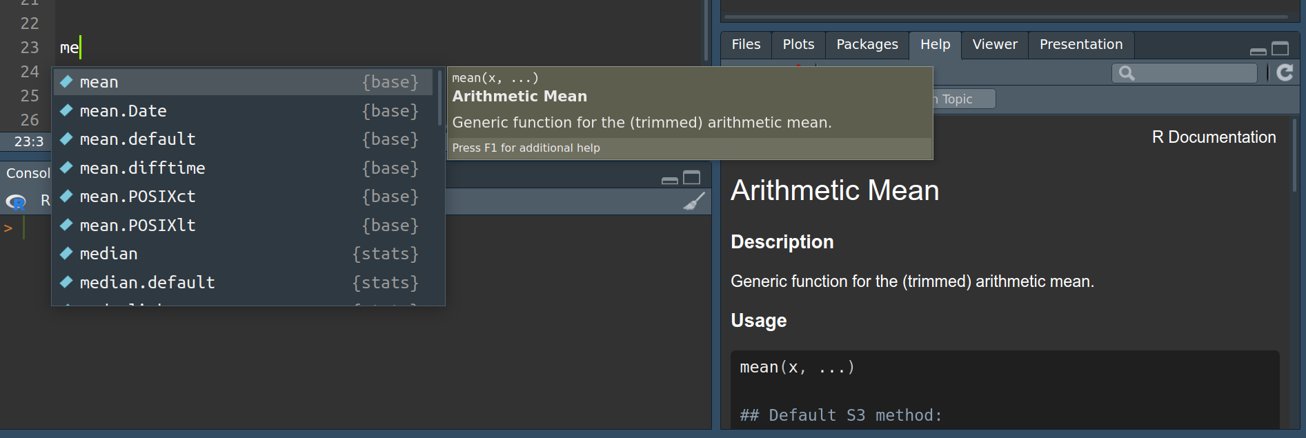 En RStudio, como ya mencionamos antes, disponemos de un área específica para mostrar la ayuda. Está área se activará automáticamente al solicitar alguna ayuda, e incluso disponemos de una función de autocompletado con ayudas en ventanas emergentes. Para activarla, solo debemos comenzar a escribir el nombre de la función y apretar la tecla Tab ↹. En la siguiente figura, podemos ver que sucede al comenzar a escribir “me + Tab ↹”: