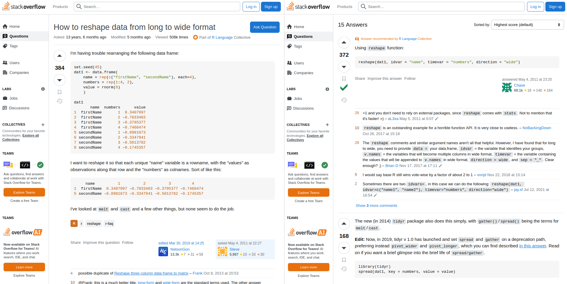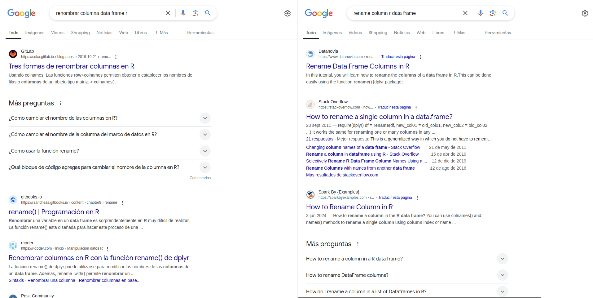 - Existen múltiples foros que incluyen hilos específicos para R, y buscar en ellos muchas veces es una forma segura de aprender como hacer algo. La única recomendación en este sentido, aunque no podemos enfatizarla lo suficiente, es que nunca debemos ejecutar código que no comprendamos. Si creemos que cierto fragmento de código nos puede ser útil, primero intentemos entenderlo con un ejemplo de juguete, en una sesión nueva, lejos de nuestros scripts de los análisis en curso. Cuando pensemos que hemos podido entender cómo funciona, entonces ya estamos listos para trasladar ese código a nuestro script. Si no encontramos la respuesta al problema específico que tenemos, en estos foros también podemos realizar una pregunta y nos responderán bastante rápido. La clave es poder expresar concretamente el problema, el resultado esperado y, en la medida de lo posible, brindar un conjunto de datos mínimo que sirva de ejemplo al que realmente queremos procesar. A continuación un ejemplo de Stack Overflow