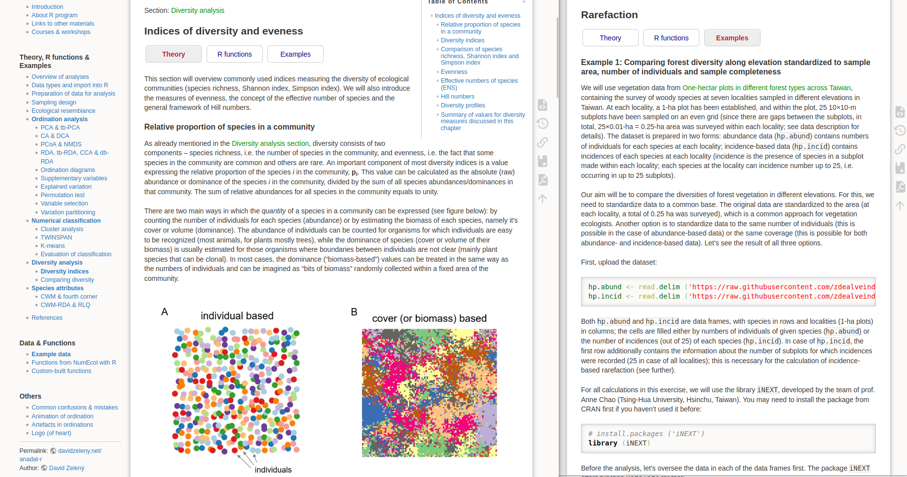 - Además de los foros, existe una cantidad inmensa de artículos en sitios webs dedicados a R, así como en blogs personales. Muchas personas, que de hecho investigan sobre problemas similares a los nuestros, dedican mucho tiempo a publicar métodos de análisis en R, incluyendo muchas veces apartados con explicaciones teóricas sobre ciertos tópicos. Nunca está de más tomarse el tiempo para ver qué encontramos. Debajo un ejemplo correspondiente a los materiales de un sitio sobre Analisis en ecologia de comunidades en R.
