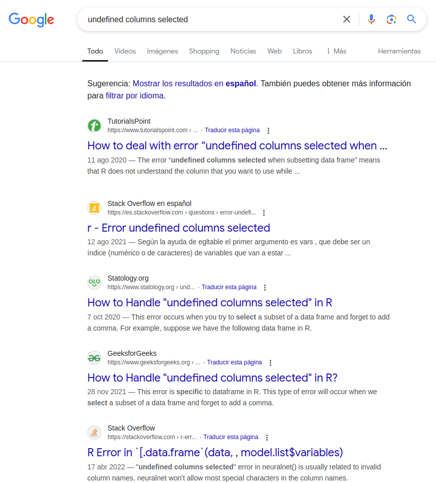 Además de estas útiles ayudas offline, si contamos con una conexión a internet, por supuesto no dudaremos en hacer uso extensivo de buscadores. Muchas veces, más que saber cómo opera una función en particular, queremos conocer cómo realizar una acción dada, con el método que sea. Aprender a buscar es en sí mismo un arte. La cantidad de sitios con información sobre R es inabarcable y muchas veces podemos perdernos en el afán de encontrar lo que buscamos, por ello a continuación veremos algunas recomendaciones.