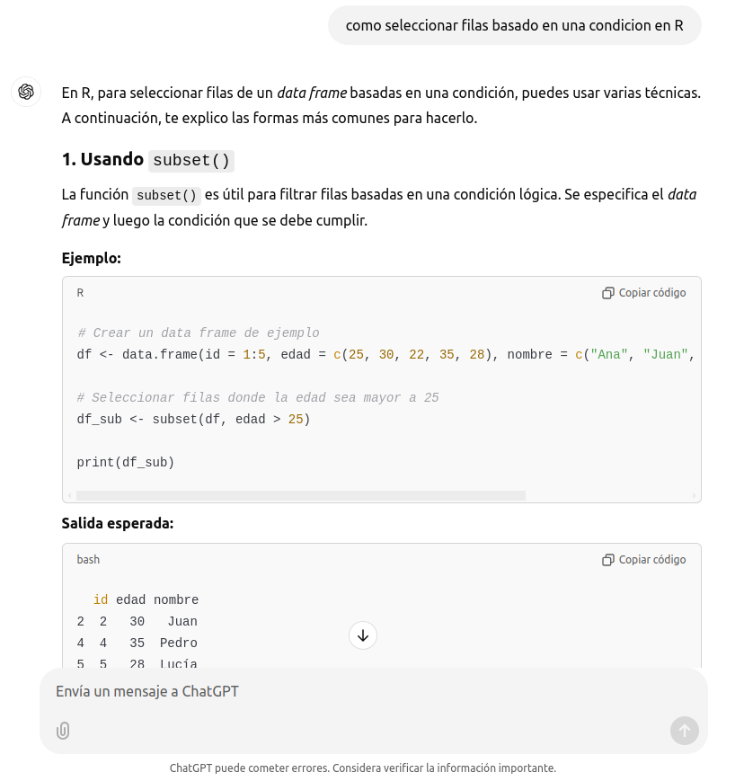 Para pensar: más adelante aprenderemos efectivamente a filtrar una tabla basados en una condición. Recuerde la respuesta brindada por la IA en este ejemplo y veremos luego si es una “buena” respuesta.