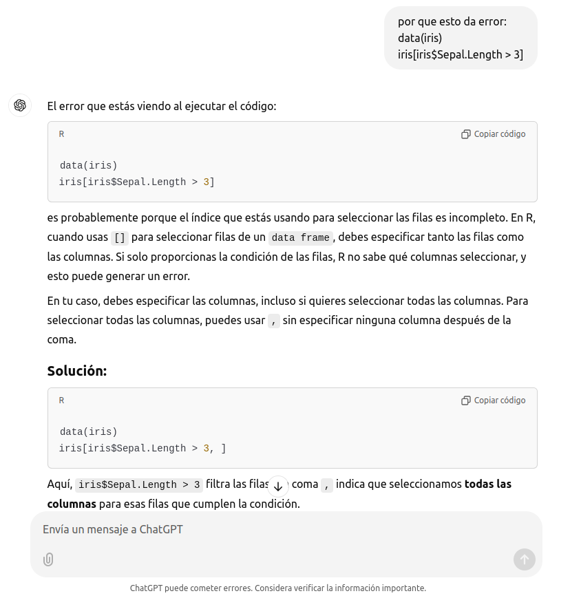 Otra fuente de ayuda en los tiempos modernos, es recurrir al chatbot de inteligencia artificial de su preferencia. Una vez más, lo importante es intentar interpretar el código previo a su ejecución. En sentido estricto, podríamos darle nuestros datos a un chatbot y pedirle todos los análisis necesarios y, si supimos desmenuzar e indicar nuestra pregunta correctamente, incluso es posible que la salida sea correcta. Dicho esto, estamos aquí para aprender a hacerlo nosotros mismos, por ende, si bien es una fuente más de ayuda, el objetivo es que aunque el código lo produzca la IA, seamos capaces de entender completamente lo que está sucediendo.
