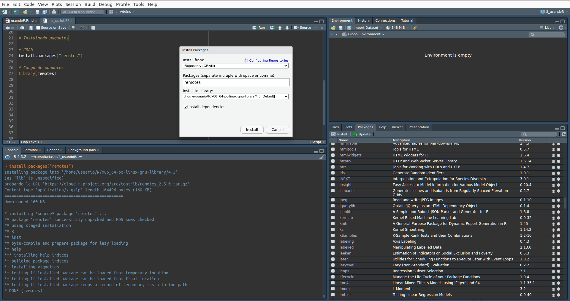 detach("package:remotes", unload = TRUE)Todo esto en RStudio también puede ser realizado simplemente tildando o destildando el paquete correspondiente en la lista de paquetes.