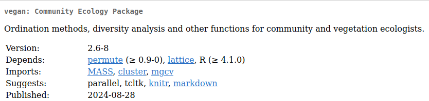 Es importante recordar que cuando realicemos la instalación, muchas veces será necesario instalar otros paquetes que son requeridos para que funcione correctamente el paquete que queremos usar. Estos paquetes necesarios se conocen como dependencias y por defecto R instalará todas las dependencias necesarias. En la siguiente imagen se muestra la descripción de vegan, un paquete muy popular para Ecología de Comunidades, dónde podemos ver que depende de los paquetes permute y lattice, en sus versiones mínimas 0.9 y 4.1 respectivamente, así como “importa” los paquetes MASS, cluster y mgcv.