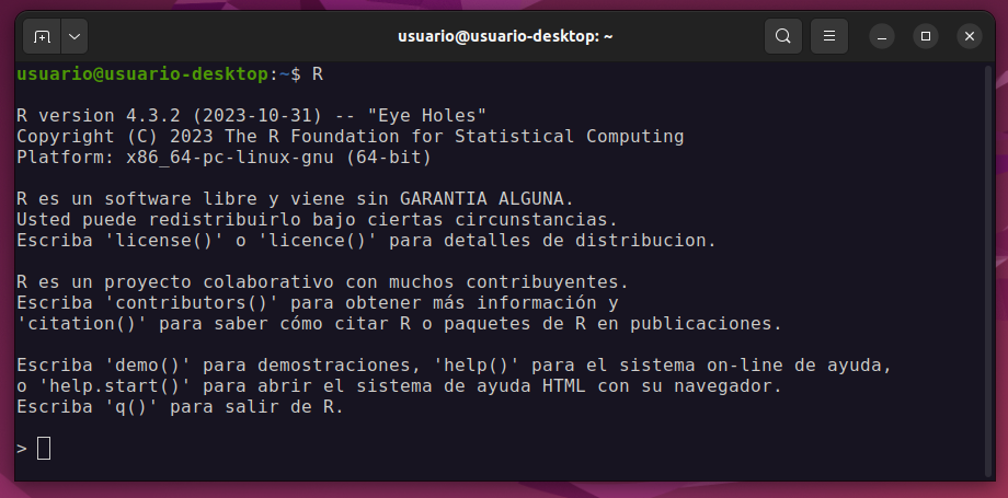 Finalmente, si deseamos salir de la sesión de R activa, podemos utilizar la función quit() (o su forma abreviada q()), a lo que R responderá preguntando si queremos guardar una imagen del espacio de trabajo, a lo que responderemos que NO ingresando n. Esto cerrará cualquier ventana gráfica que hubiera abierta, así como en nuestra terminal veremos que el prompt vuelve a ser el de nuestro sistema.