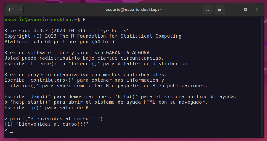 Cuando R es iniciado de esa forma, veremos un texto con una pequeña presentación de R, incluyendo la versión que se está ejecutando y algunas ayudas básicas. Luego de este texto, vemos una línea vacía comenzada por el carácter >. Este último carácter se conoce como prompt y nos indica que R está listo para recibir órdenes. Así pues, podríamos pedir que nos imprima una bienvenida al curso utilizando la función print(), haciendo por ejemplo: