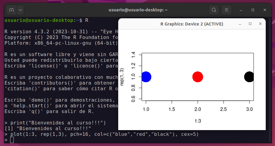 Aún funcionando desde un CLI, sin una interfaz gráfica, debido a que R está pensado para funcionar en sistemas de ventanas, es posible realizar gráficos y estos se mostraran en una nueva ventana exclusivamente creada para tal fin. Podríamos por ejemplo graficar 3 puntos de diferentes colores, ubicados en las coordenadas (x,y)=(1,1 ; 2,1 ; 3,1):