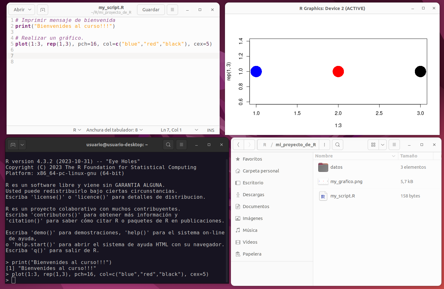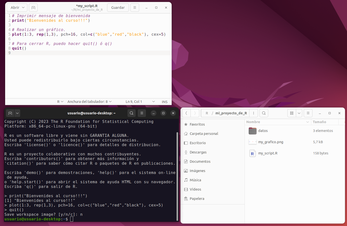 Como al usar R de esta forma sólo podremos ir ejecutando de a una orden a la vez, puede ser conveniente disponer de algún editor de texto plano para poder ir guardando nuestro código a medida que lo vamos escribiendo y ejecutando. Para ello podemos utilizar cualquier editor de texto plano (e.g., en GNU/Linux podemos usar “gedit” o el editor que traiga nuestra distribución; en Windows podemos utilizar “Bloc de Notas”, “Notepad++”, etc). Aprovechando el espacio del escritorio de nuestra PC podríamos entonces hacer una disposición con las ventanas abiertas de nuestra terminal donde ejecutamos R, la ventana gráfica donde se mostrarán nuestros gráficos, el archivo de texto plano con nuestro código y podríamos sumar también una ventana con las carpetas donde estamos guardando el trabajo y desde donde leeremos los datos que cargaremos a R. Algo parecido a lo siguiente: