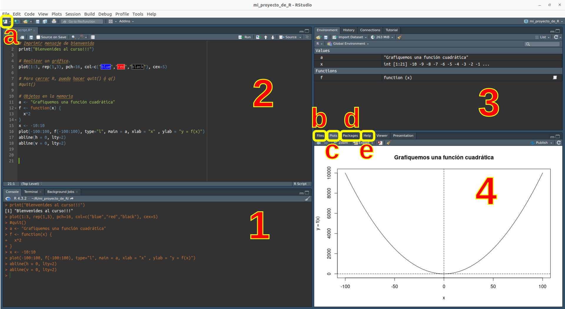 Archivos, Gráficos, Paquetes, Ayuda: esta es una área de mucho uso ya que permite ver y manipular el sistema de archivos dónde estamos trabajando [b], así como gestionar los paquetes de R gráficamente [c]. Además, cambiará automáticamente al área gráfica cuando realicemos un gráfico [d] y cambiará a las ayudas internas disponibles en caso de solicitarlo [e].