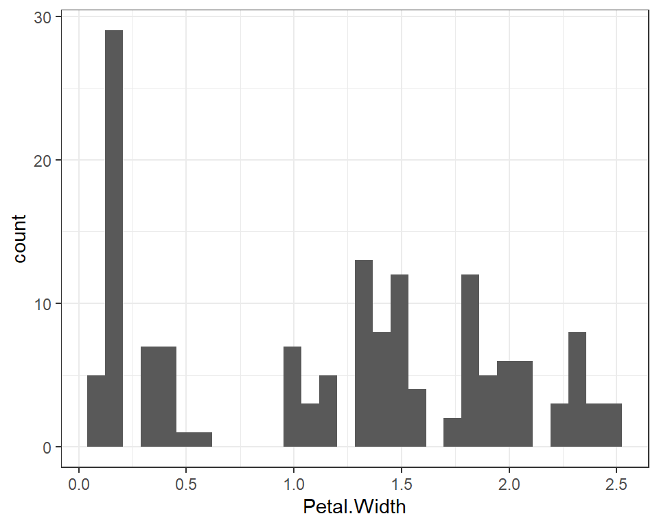 plot1 <- ggplot(iris, aes(x = Petal.Width))Aquí, al objeto plot1 le es asignado a un gráfico que aún no posee capas gráficas, pero sí posee una tabla asociada y una variable x asociada a una columna de esa tabla. Podemos hacer uso del nuevo objeto y el operador + para añadir nuevas capas y personalizaciones al gráfico: