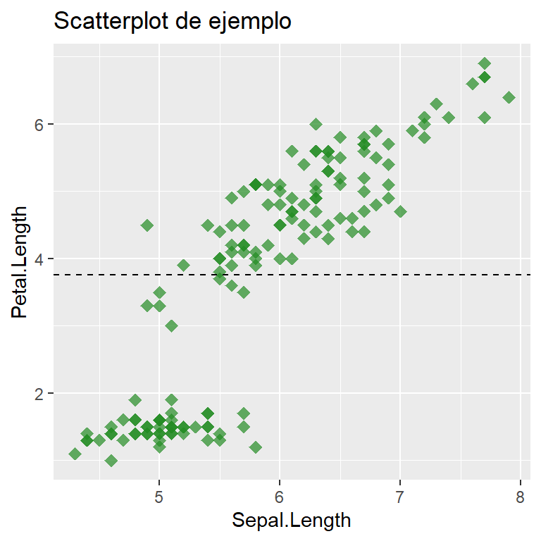 La función geom_hline() agrega una línea horizontal: el argumento yintercept indica el valor para y por donde pasará la línea, aquí indicado por el valor promedio de la variable y; el argumento lty permite elegir un estilo para la línea. La función ggtitle() añade un título.