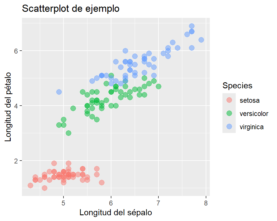 Ahora bien, el gráfico que venimos haciendo incluye a las variables florales de las tres especies de Iris provistas dentro del conjunto de datos. ¿Cómo hacemos para diferenciarlas en el gráfico? Debemos indicar una nueva variable dentro de aes(), asociada a un parámetro gráfico apropiado. En este contexto, lo mejor sería que los puntos tengan diferentes colores por especie: