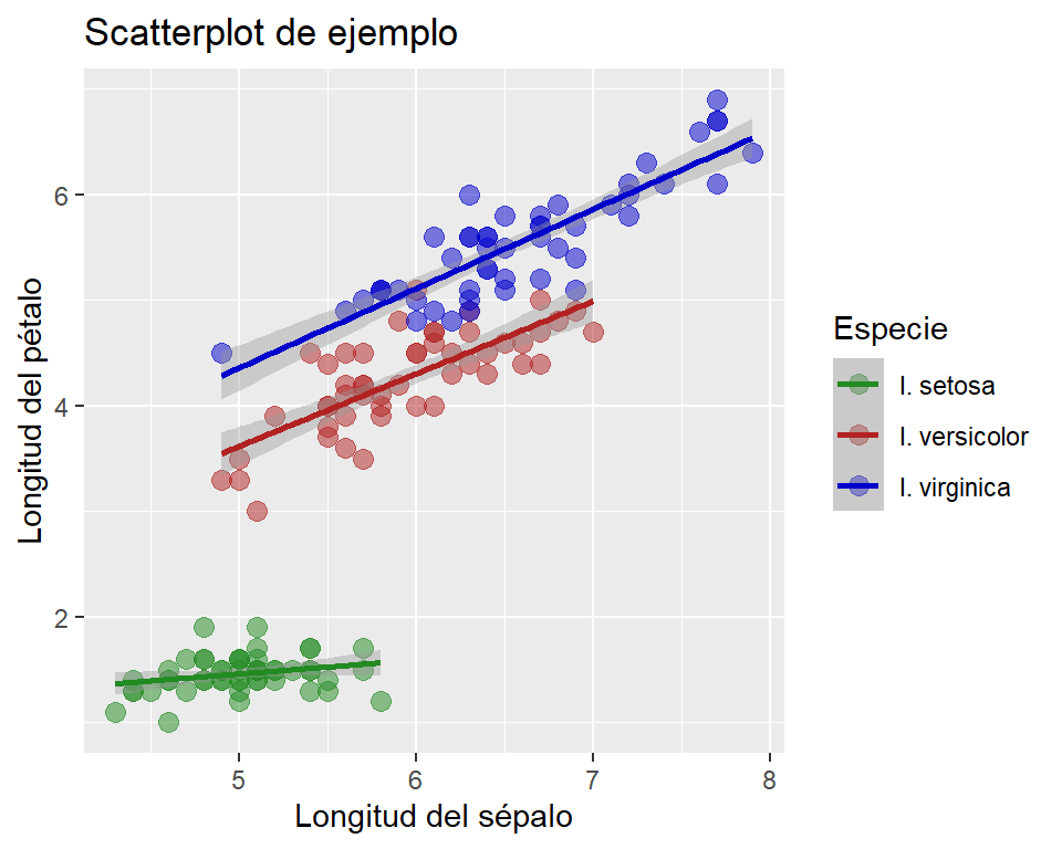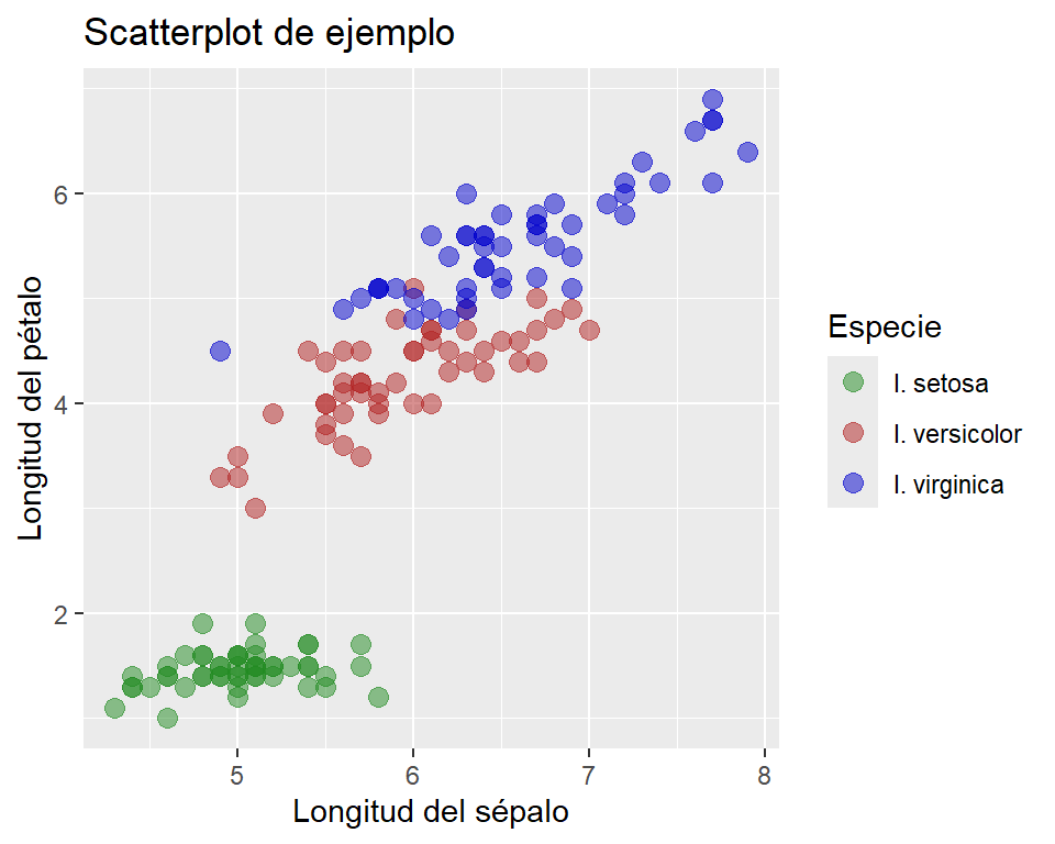 Notar el agregado de la variable color asignada a la columna “Species” de nuestra tabla, así también como la no definición de un color fijo dentro de la función geom_point() (porque la idea es que haya un color distinto para cada especie). Aquí, bien podríamos haber definido otro parámetro gráfico a modificar según las distintas especies, tales como la forma (shape) o el tamaño (size). Volviendo a nuestro código anterior, ¿cómo definimos colores específicos para cada nivel? La función scale_color_manual() es la indicada:
