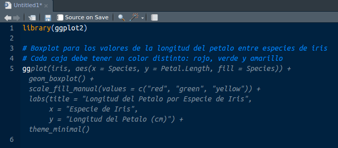 El agente Copilot se vuelve más interesante cuando le pedimos ayuda para escribir bloques de código más completos. Para ello, debemos contextualizar el pedido, mediante el uso de un comentario con #. Por ejemplo, imaginemos que deseamos realizar un gráfico de cajas (o boxplot) en ggplot2, para el dataset iris:
